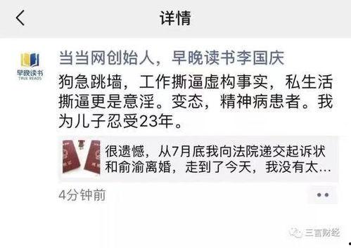 那么,这个微信爆料视频里到底说了些什么呢?据网友透露,视频中俞渝透露了自己的一些私生活细节,包括与丈夫李国庆的婚姻状况、个人情感经历等。视频中的内容可谓是相当劲爆,让不少网友直呼“没想到”。